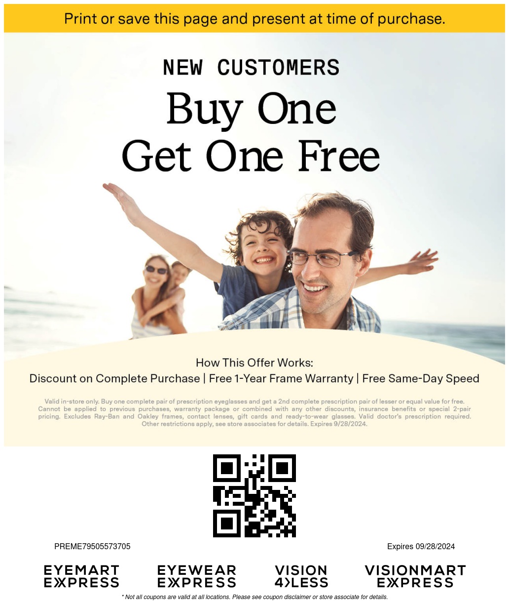 Valid in-store only. Buy one complete pair of prescription eyeglasses and get a 2nd complete prescription pair of lesser or equal value for free. Cannot be applied to previous purchases, warranty package or combined with any other discounts, insurance benefits or special 2-pair pricing. Excludes Ray-Ban and Oakley frames, contact lenses, gift cards and ready-to-wear glasses. Valid doctor’s prescription required. Other restrictions apply, see store associates for details.