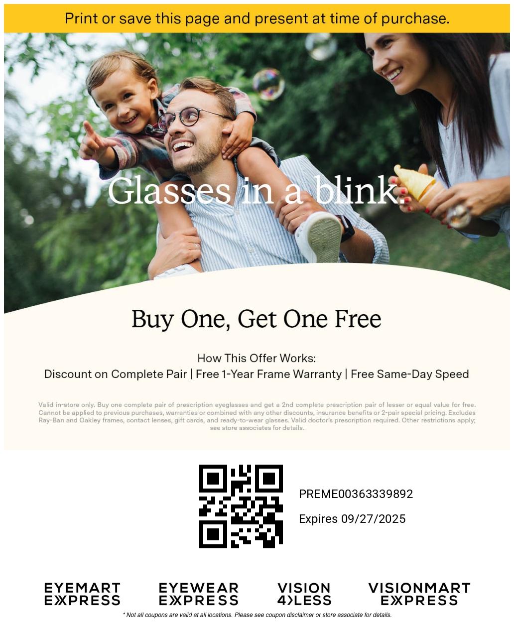 Valid in-store only. Buy one complete pair of prescription eyeglasses and get a 2nd complete prescription pair of lesser or equal value for free. Cannot be applied to previous purchases, warranties or combined with any other discounts, insurance benefits or 2-pair special pricing. Excludes Ray-Ban and Oakley frames, contact lenses, gift cards, and ready-to-wear glasses. Valid doctor’s prescription required. Other restrictions apply; see store associates for details.